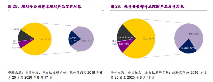 同时,理财子公司的零售占比更大,这与部分理财子公司零售财富管理的定位、资管部发行对公产品更具有行内协同优势等因素有关。数据显示,理财子公司面向个人发行的产品占比高于母行资管部产品近20个百分点。