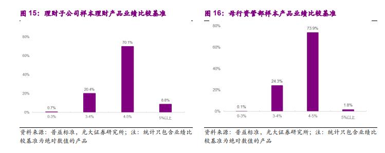 根据光大证券研报数据,整体来看,理财产品的业绩比较基准均集中于3%-5%。其中,3%-4%占比2成左右,4%-5%占比7成左右。但理财子公司产品收益率在5%以上的产品占比达8.8%,显著高于母行资管部产品7个百分点。