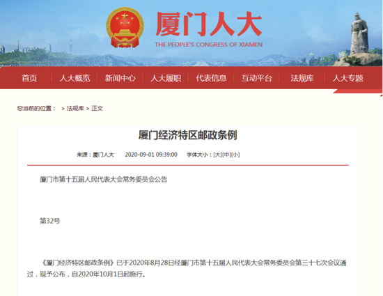 据央视新闻客户端9月2日消息,《厦门经济特区邮政条例》(以下简称《条例》)已于近日经厦门市第十五届人民代表大会常务委员会第三十七次会议通过,9月1日正式发布相关条款。