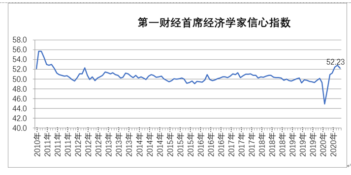 2020年9月“第一财经首席经济学家信心指数”为52.23,低于上月,但仍位于两年内高位,本月经济学家们均给出了高于50荣枯线的预测,他们认为未来一个月我国经济将持续好转。