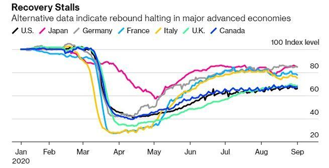 经济学家Tom Orlik表示,高频数据显示,美国第二季度经济迅速反弹,而第三季度则出现停滞——活跃程度仍远低于疫情爆发前的水平。不过,美国经济还有进一步发展的空间。例如,如果美国能像德国一样控制疫情,并让人们重返工作岗位,这将产生重大的积极影响。但是,若想经济恢复至疫情爆发前的正常状态,就需要发明疫苗。