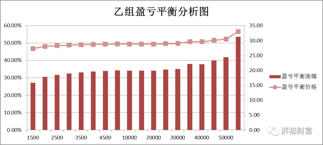 由图上可见乙组盈亏平衡情况只有一种情况,就是盈亏平衡点稳步上升,类似于甲组尾部的第三阶段,融资成本一直在涨涨涨,最终到顶头锤阶段达到最大的盈亏平衡点50%,也就是股价要至少上涨50%到33元才能盈亏平衡。虽然农夫山泉有实力上涨50%以上,但是成本太高,效益太低,甚至还有亏损的可能性。顶头锤的大户们这次打新农夫山泉这笔买卖不是很赚,甚至不如甲尾和乙头。