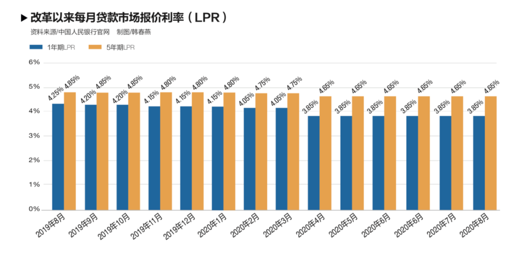 按照最新全国银行间同业拆借中心受权公布的公告,2020年8月20日1年期和5年期以上LPR分别为3.85%和4.65%。