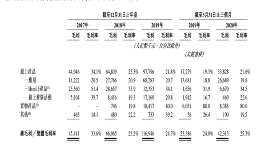 招股书显示,乐享互动2017、2018、2019年的营业收入分别为1.35亿元、2.62亿元及4.74亿元,2017-2019年复合年增长率高达87.4%,然而,与逐年增长的收益不同的是,公司的毛利率却连续2年下降,乐享互动2017-2019对应的毛利率分别为33.6%、25.2%及24.7%。公司解释到,2018较2017年毛利率下降的原因主要由于拥有较高毛利率的Html 5产品的收益百分比下降及提供高利润率营销活动的一名客户于2018年改变业务重心而不再与乐享互动合作。值得注意的是,除了应用产品的毛利率比较稳定之外,Html 5产品及在线推广活动的毛利率都有所下降, Html 5产品的毛利率由2017年的51.4%跌至2019年的34.1%,而在线推广活动的毛利率由2017年的39.7%降至2018年的19.3%。