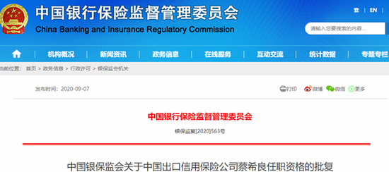 9月7日,银保监会公布了蔡希良任中国出口信用保险副董事长、总经理的任职资格。而这一任职,是自4月10日王廷科转战中国人保后的一个“补位”。