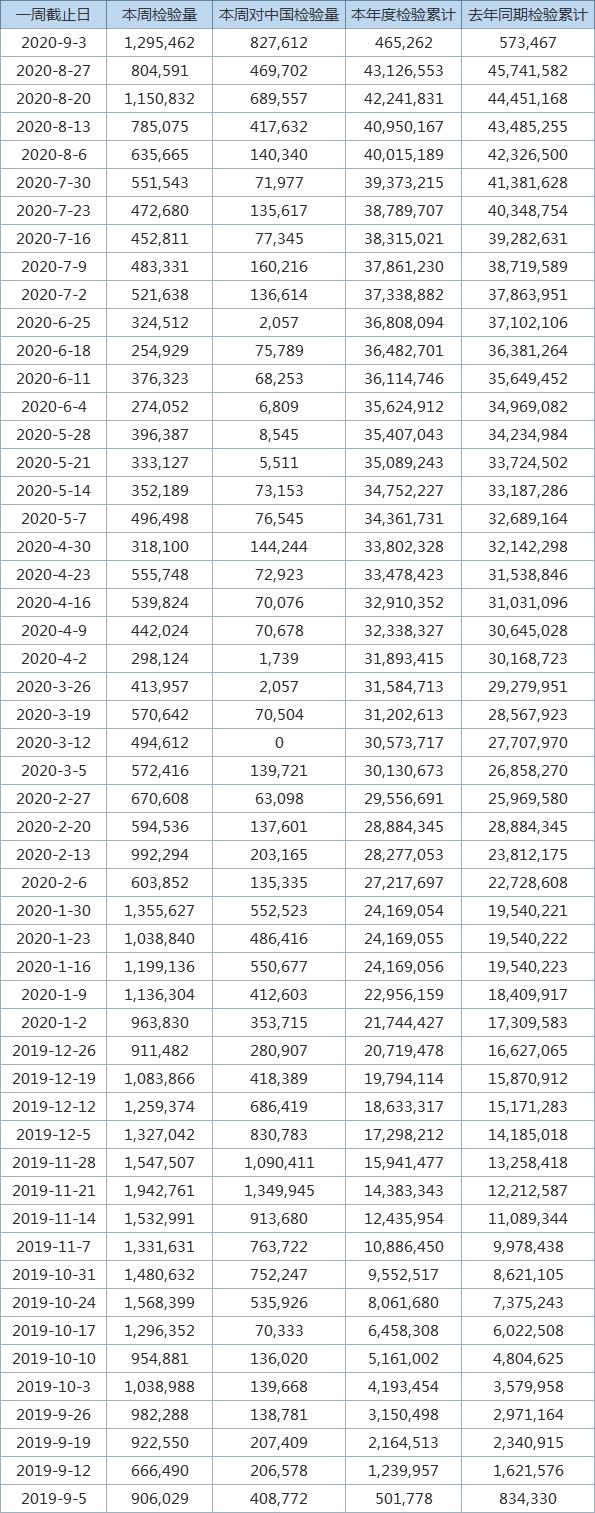 美国农业部出口检验报告公布,截至2020年9月3日当周,美国大豆出口检验量为1,295,462吨,明显高于市场预估,较之前一周暴增61.01%,刷新2月以来新高。当周,对中国大陆的大豆出口检验量为827,612吨,占出口检验总量的63.89%。