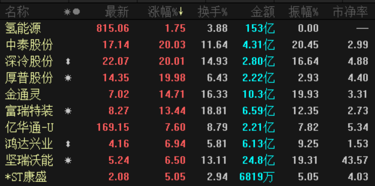 受此政策利好刺激,今日氢能源股逆市上涨,板块指数盘中一度冲击年内最高点,半日成交超昨日全天成交。中泰股份、深冷股份、厚普股份、四方达20%涨停,金通灵、富瑞特装涨幅超10%,开尔新材、美联新材、永泰能源等纷纷逆市大涨超5%。