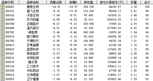 不过,低价股影响的只是情绪,真正影响指数涨跌的还是一些权重股。受利空消息影响,康泰生物今天大跌超16%,影响指数将近15个点。智飞生物、沃森生物对指数的负面影响紧随其后。