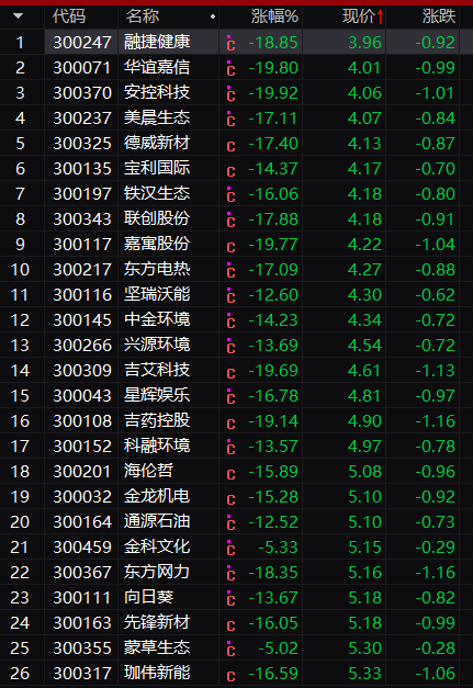 创业板4元股早盘一度绝迹,融捷健康收盘跌回3元股,华谊嘉信(维权)等再成4元股。创业板注册制第一批新股锋尚文化跌超4%,跌破发行价,为注册制首只破发股。下午两点之后,空头势力突然猛增,创业板低价股集体放量大跌。据记者粗略统计,在创业板跌幅超过10%的股票中,有98只股票股价低于10元。