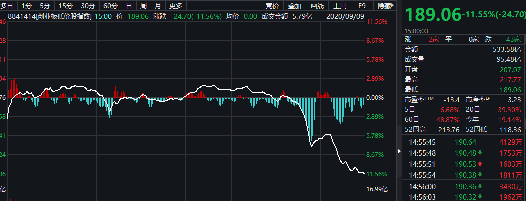 创业板低价股指数收跌11.55%,全天振幅接近14%。
