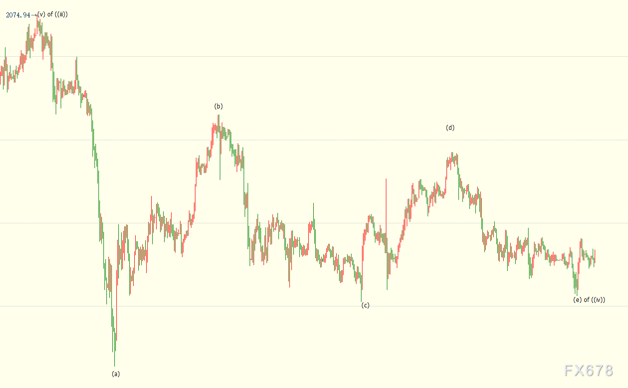 小时图上看,金价似乎已在1906美元结束自1993美元开启的下行(e)浪走势,(e)浪是自2075美元开启的调整((iv))浪的子浪。((iv))浪呈现(a)(b)(c)(d)(e)五子浪震荡收敛楔形形态。