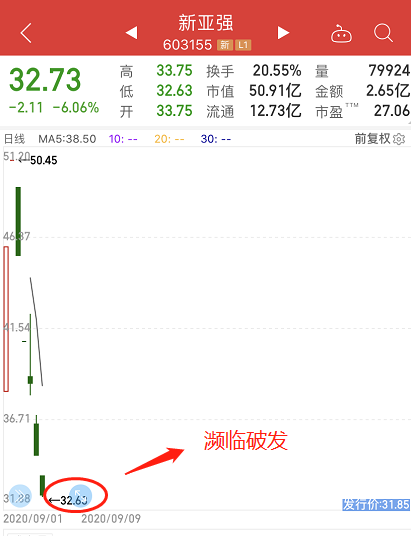 沪市主板新股新亚强,发行价为31.85元,9月1日上市后拉出2个涨停,而后连续跌停、暴跌,今日暴跌逾6%后报32.73元,距离破发也就一步之遥,而上市7个交易日,该股换手率也不到100%,即还有中签投资者未卖出。