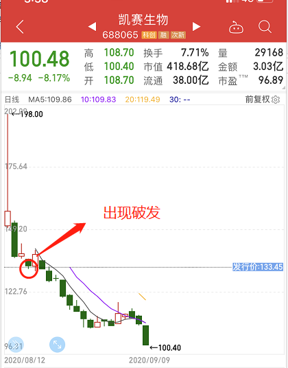 不只是瑞联新材,近期上市的凯赛生物,从发行价133.45元,上市后第4个交易日出现破发,而后一路跌至今日的100.48元,破发跌幅达24.71%。