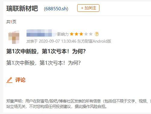 中签没早卖的投资者一脸懵逼!瑞联新材的股吧中,有人表示,“中10签亏6W”,也有表示第一次中新股,就亏了。
