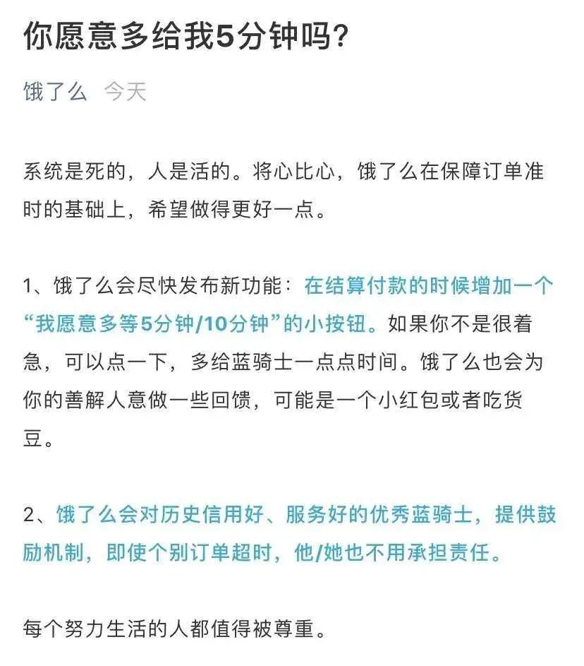 饿了么提出给用户“愿意多等5分钟/10分钟”的自主小按钮,很多人说这是转嫁矛盾,我想这也许不是饿了么的本意,但确实并不一定能解决问题,反而会让骑手利用这5-10分钟多接一单。