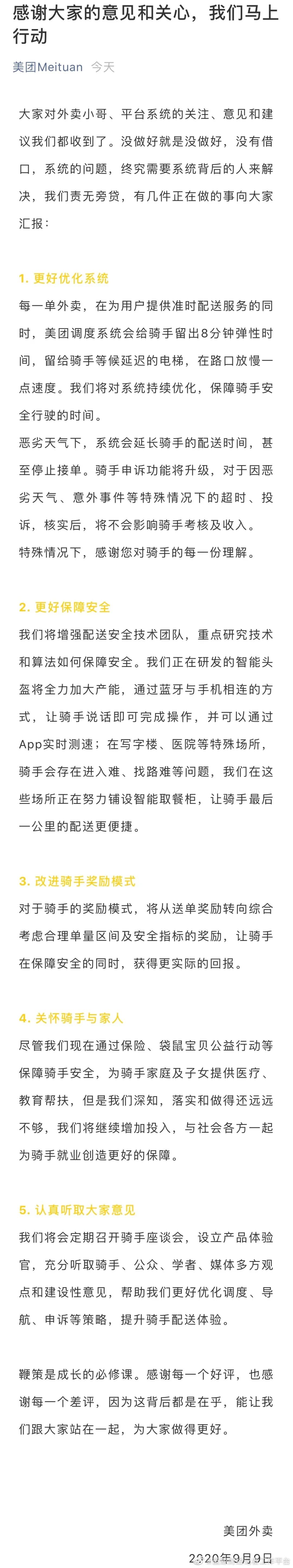 美团昨日傍晚发声:首先正面回应此事,表示“错了就是错了,没有借口”,随后宣布了五项改进举措,包括优化系统;给骑手留出8分钟弹性时间;研发智能头盔;改进骑手奖励模式;继续增加对骑手与家人的关怀等。