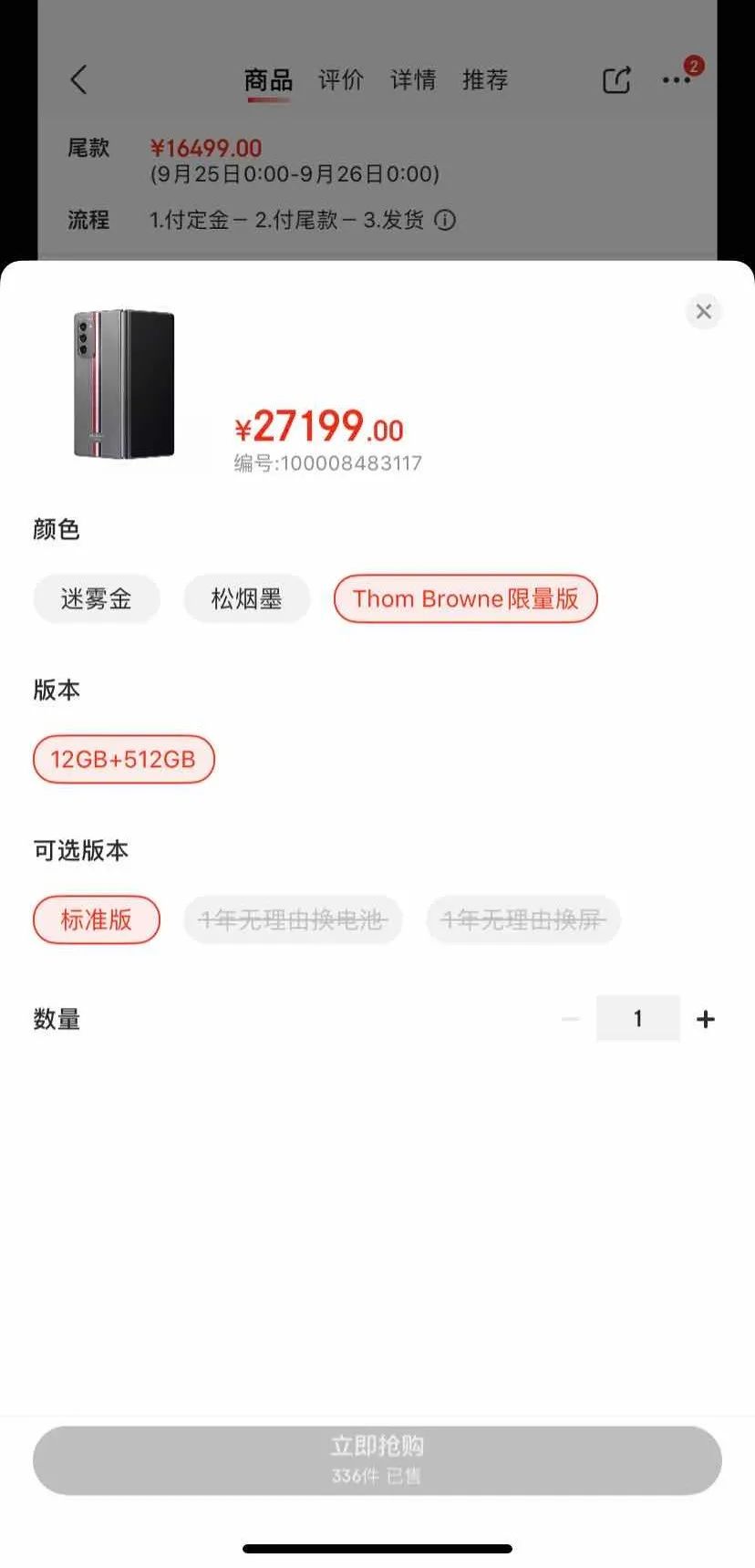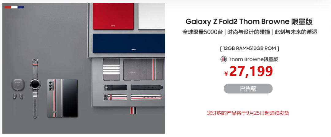 目前,三星中国官网上,ThomBrowne限量版显示已售罄,京东三星手机自营店也显示该限量版已售罄,共计售出336台。天猫平台上该限量版也已售罄,不过定价为16999元起的普通版在上述平台仍然显示有货。