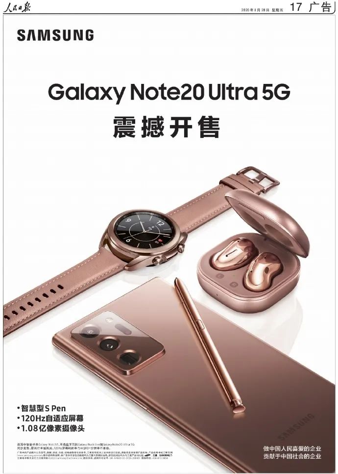 8月28日,三星在报纸上投放整版Galaxy Note20 Ultra 5G手机广告,其海报右下方的广告词是“做中国人民喜爱的企业,贡献于中国社会的企业”。