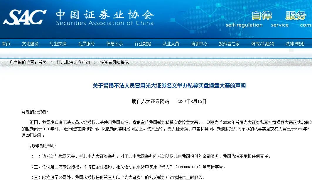 无独有偶,就在数天前,光大证券也在官网宣布,发现一则题为“2020年首届光大证券私募实盘操盘大赛正式启航”的假新闻刊登在众多财经网站上。