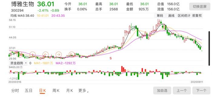 9月11日,受大股东高特佳老板私情事件影响,博雅生物(300294)低开2.41%,股价报36.01元/股。受二级市场整体环境等因素影响,近期博雅生物的股价也出现一波大幅下跌。自8月6日股价创下新高后便一路下挫,累计跌幅达36.39%。