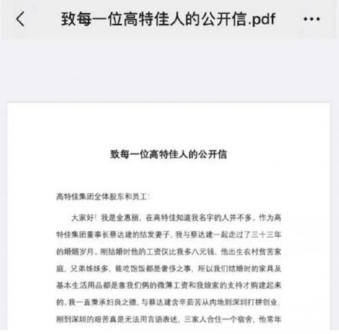 9月10日,一封《致每一位高特佳人的公开信》在网上流传,作者金某是高特佳集团董事长蔡达建的结发妻子,她实名举报蔡达建与原下属张某楠长期保持不正当关系,且蔡达建动用高特佳的力量与她打离婚官司。
