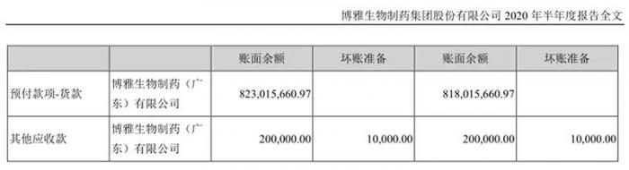 据博雅生物2020年半年报显示,到2020年6月底,博雅生物对丹霞生物的预付款余额为8.23亿元,另有20万元的其他应收款。公司对20万元应收款计提了1万元坏账准备,对8.23亿元预付款却完全未计提。