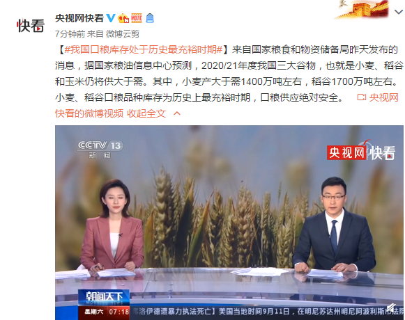 来自国家粮食和物资储备局昨天发布的消息,据国家粮油信息中心预测,2020/21年度我国三大谷物,也就是小麦、稻谷和玉米仍将供大于需。其中,小麦产大于需1400万吨左右,稻谷1700万吨左右。小麦、稻谷口粮品种库存为历史上最充裕时期,口粮供应绝对安全。