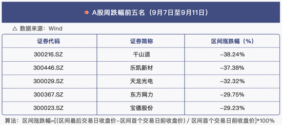 创业板两家公司乐凯新材(300446.SZ)和天龙光电(300029.SZ)因触及其他风险警示(ST)情形,收到监管部门的“退市警告”,两家公司将于9月12日起戴上“ST”帽子,受此影响,这两家公司分别位列本周跌幅榜第二、第三名,跌幅仅次于将要退市的千山退(维权)(300216.SZ,原名千山药机)。