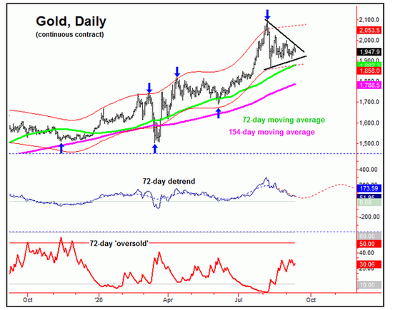 在72天周期上,动能指标正在下行,这是金价可能维持弱势至月末的信号。在超卖状况下,需要见到突破上轨的情况,将暗示跌势结束可以买入。