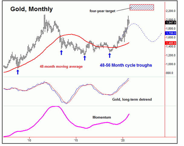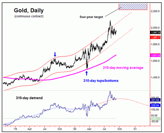 在价格层面,2212-2340的区域在未来数月将被触及,310天周期也匹配这一价格水平。在这个级别上的时间节点来看,涨势将至少持续至秋末,价格则应该保持在通道支撑上方,目前这个水平位于1850,随着时间的变化,预计将会逐渐抬高。