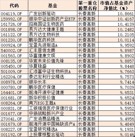 广发创新驱动、银华中证创新药产业ETF、招商国证生物医药、易方达大健康主题、易方达生物科技、鹏华医药科技6只基金,重仓长春高新市值占基金资产净值比更是超过了10%。
