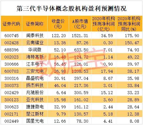 根据5家以上机构一致预测数据,今年有13只概念股净利润有望同比增长,分别包括闻泰科技、云南锗业、华润微、海特高新、江丰电子。机构一致预测闻泰科技净利润为34.59亿元,同比增长175.9%,预测净利润增幅最高。