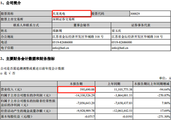 红星资本局注意到,天龙光电被ST,是因为公司已经连续两年亏损。而今年上半年,天龙光电的营收仅有区区59.57万元,净利润亏损达1433.05万元。