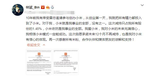 其后小米集团方面回应称,林斌自小米集团上市以来一股都没卖过,上市时也未发生过老股转让;减持套现是林斌个人资金用途需要,包括做慈善等;林斌短期内不会再减持,自愿做出锁定十二个月的承诺。
