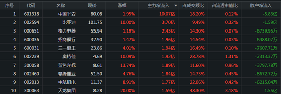 从个股来看,主力资金最青睐的3只股票分别是中国平安、比亚迪、格力电器,流入金额分别为10.07亿元、3.90亿元、2.43亿元,所对应的涨幅分别为1.95%、10.00%、1.19%。