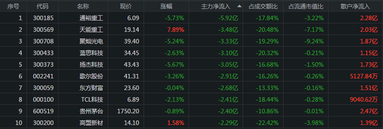 被主力资金抛弃的个股有通裕重工、天能重工、聚灿光电,流出金额分别为5.92亿元、3.48亿元、3.33亿元。