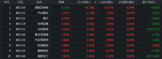 主力资金主要流入保险及其他、汽车整车、银行三个行业,流入金额分别为10.18亿元、5.33亿元、4.83亿元,其中散户净流入金额为-6.83亿元、-2.05亿元、-2.98亿元。三个板块的涨幅分别为-0.32%、1.47%、0.18%。