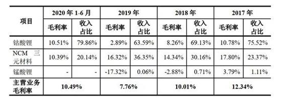 值得注意的是,近年来对厦钨新能营业收入贡献较大的钴酸锂毛利率逐步走低。2017年度至2019年度,钴酸锂的毛利率分别为10.78%、8.26%和2.89%;同期,NCM三元材料的毛利率分别为17.8%、14.34%和16.32%。