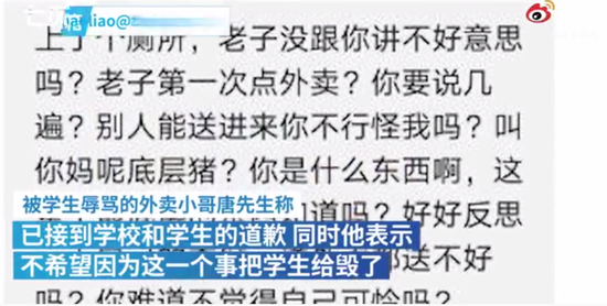 原标题:被骂“底层猪”的外卖员表示:不希望因此把学生毁了!网友:点外卖还有优越感?