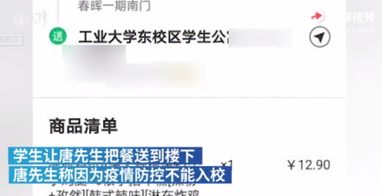 当日,外卖员唐先生将外卖送至一大学门口,可是因为疫情,高校都是封闭管理,所以唐先生无法进入校园将外卖送到宿舍楼下。