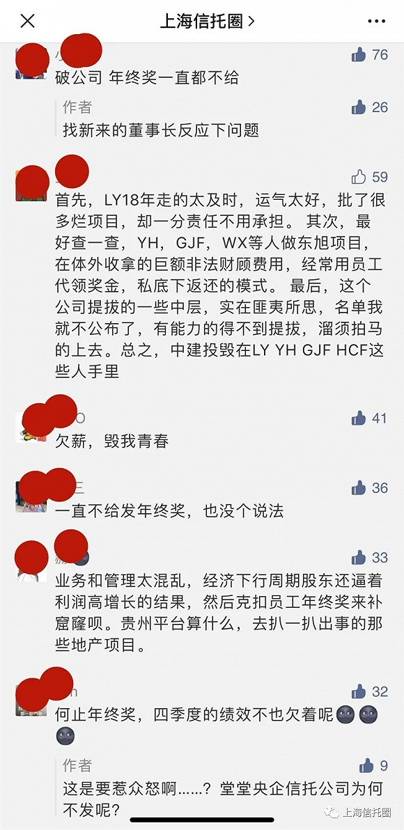 另外,在某微信公众号后台,有多名自称中建投信托员工反映公司治理混乱拖欠年终奖等情况。
