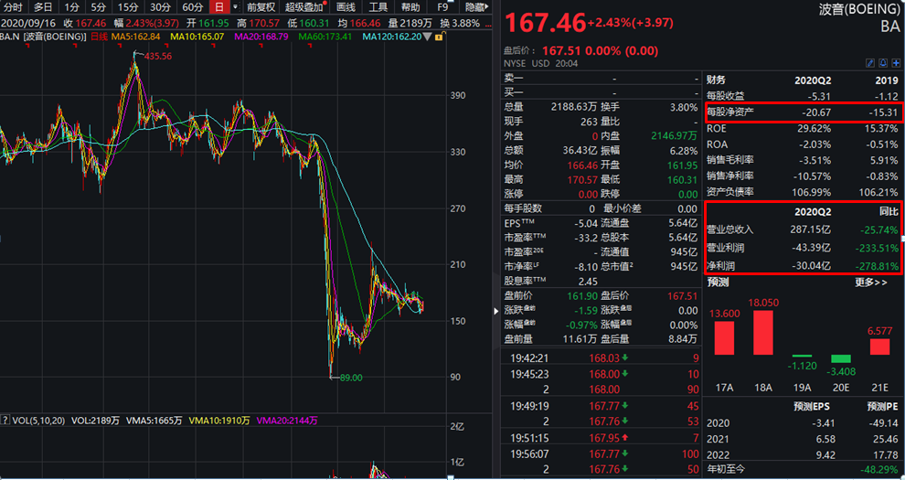 到目前为止波音737MAX被全球禁飞,其重新认证程序仍未完成,再加上新冠疫情对航空业的打击,波音股价今年以来以下降50%,从2019年3月(第二起MAX737空难事故)到今年3月,波音股价更是从最高435.56美元,一度跌至89美元,下跌近80%。