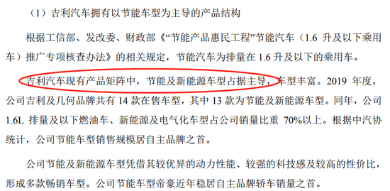 吉利汽车认为,汽车制造业是符合国家战略的高新技术产业和战略性新兴产业,吉利汽车作为中国自主品牌乘用车龙头企业,产品以节能及新能源汽车为主,并已形成 “高效燃油动力”和“多元化新能源”两大并行节能减排路线,符合 “节能环保”行业定位。