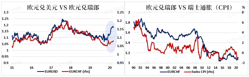 然而,如右下图所示,坚挺的瑞郎一直在打压着瑞士的通胀,瑞士央行定会在未来某个时间点推动瑞郎贬值,以刺激中期通胀预期。