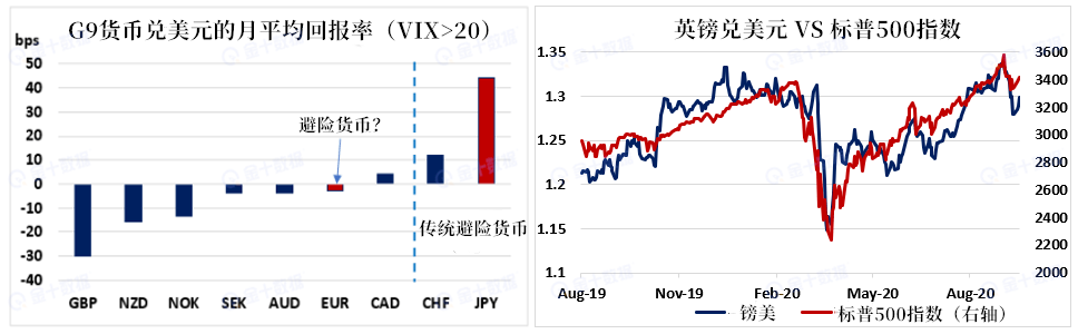 左下图显示的是,在过去30年里,当VIX恐慌指数大于20时,G9货币兑美元的月平均回报率。有趣的是,在高波动性时期,英镑一直是G9货币中降幅最大的,因此,如果大选前美股再次修正,那么欧元肯定会跑赢英镑。