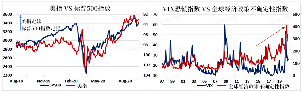 左下图显示,在过去的一年里,美元的疲软主要与股票的上涨有关,因此在当前水平做多美元可以为投资者对冲美股的回调。随着美国大选临近,价格大幅波动的频率会变高,美股的震荡也会随之加剧;右下图显示,近几个月来,不确定性再次上升,因此VIX恐慌指数也在不断上升。