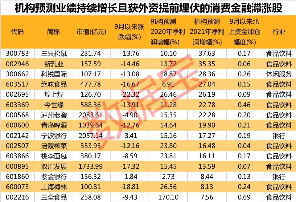 统计显示,食品饮料、休闲服务以及银行板块,9月份以来跑输大盘且9月份获北上资金加仓,机构预测2020年、2021年净利润实现增长股仅有15只,包括4只千亿市值股泸州老窖、宁波银行等。从市场表现看,跌幅较大的有煌上煌、上海梅林、双汇发展及绝味食品,4股9月份以来跌幅均超过15%,紫金银行、宁波银行及泸州老窖跌幅均低于5%。