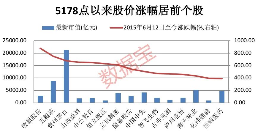 翻倍个股不仅仅是以上食品饮料行业个股(只考虑5178点以前上市股),统计显示,自5178点以来股价翻倍个股有123只,涨幅居首的是牧原股份,自2015年6月12日至今股价涨超8.5倍,中公教育、恒立液压、隆基股份、中国中免股价涨幅均超过5倍。与此同时,跌幅较大的以ST股、退市股为主。