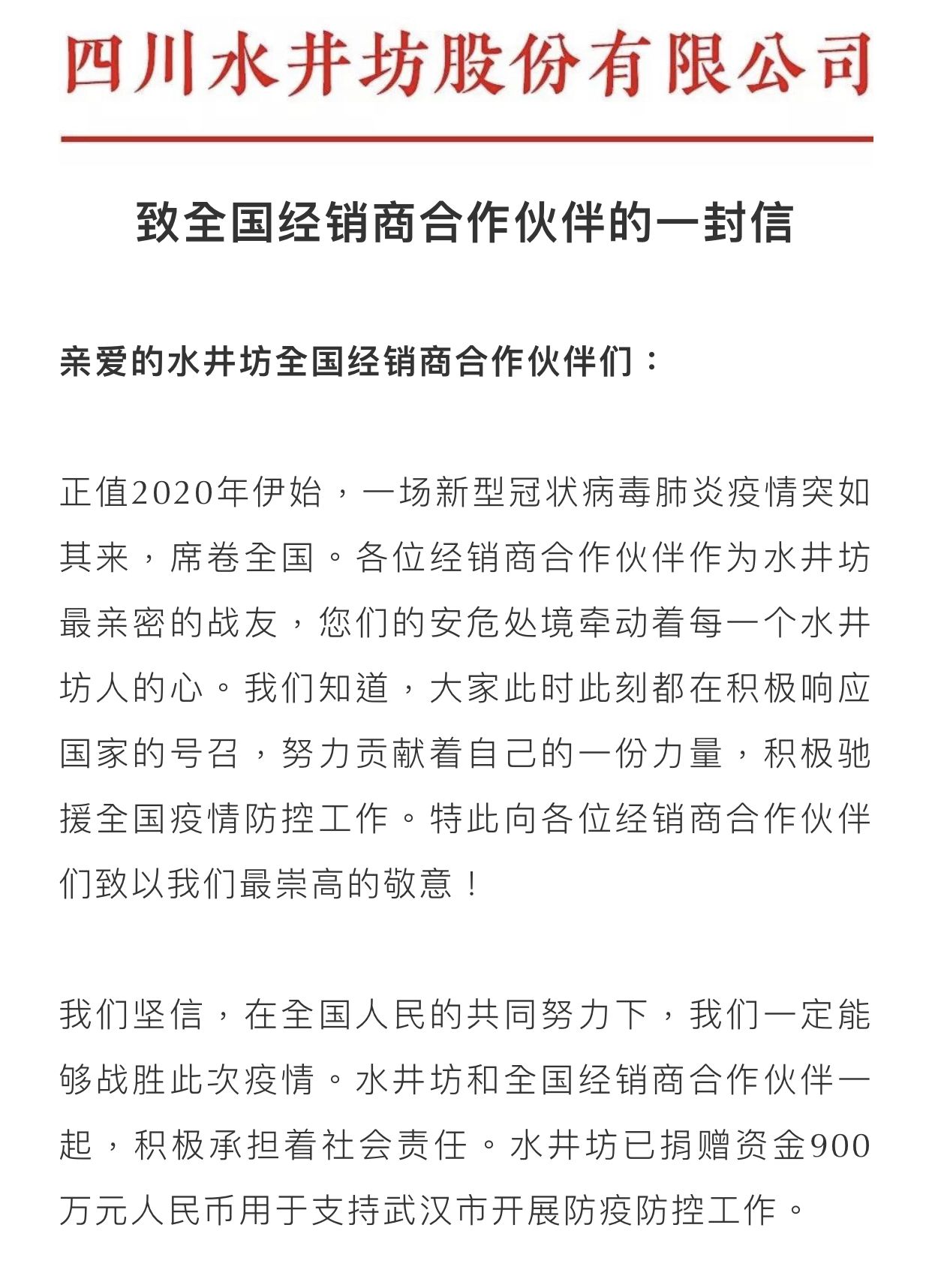 为稳定“军心”,危永标于2020年2月2日分别以个人署名的方式,向全国经销商以及门店客户发出公开信。在对门店客户的信中,危永标表示捐赠900万元用于支持武汉市开展疫情防疫防控工作。同时表示一段时间内包括白酒在内的各行各业会受到不同程度的冲击。