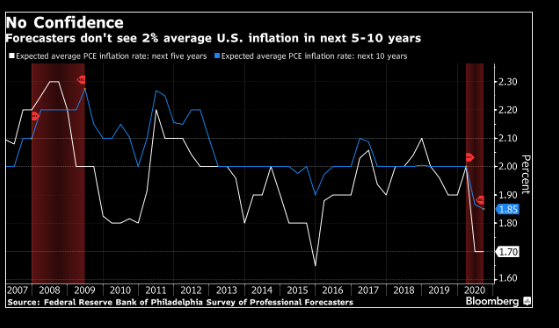 如下图所示,预测人士认为,未来5-10年美国的通胀率无法达到2%